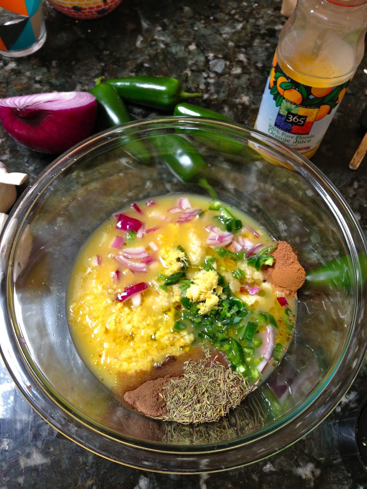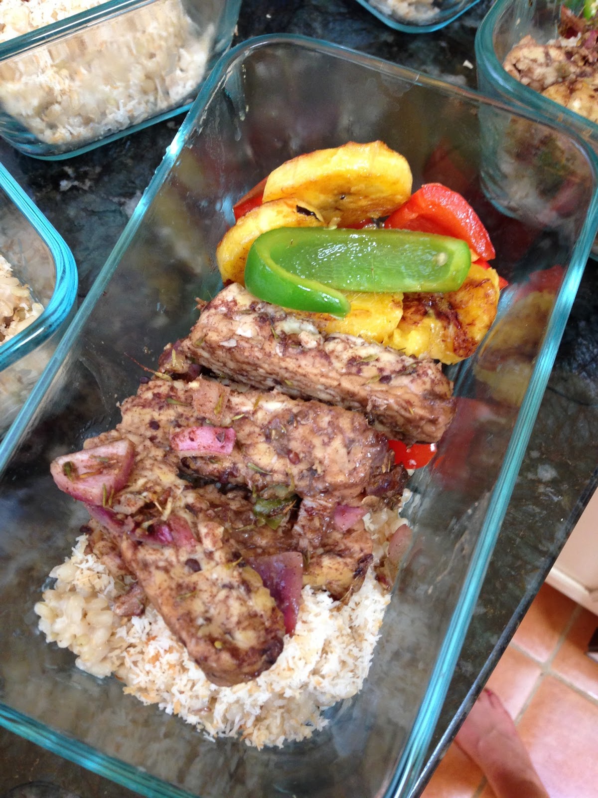 To go with it, I made coconut milk rice by cooking brown short grain rice in coconut milk instead of water and then sauteed up some peppers and plantains in coconut oil too. It was a Caribbean feast!