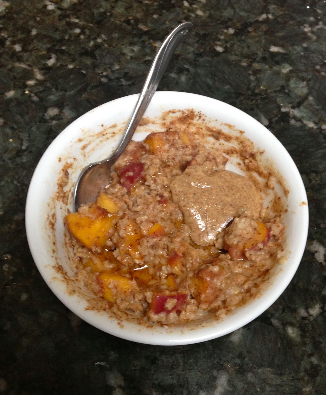 Warm cinnamon peach oatmeal with maple syrup and almond buttahhh was the perfect afternoon snack. Mmmmm….oats.