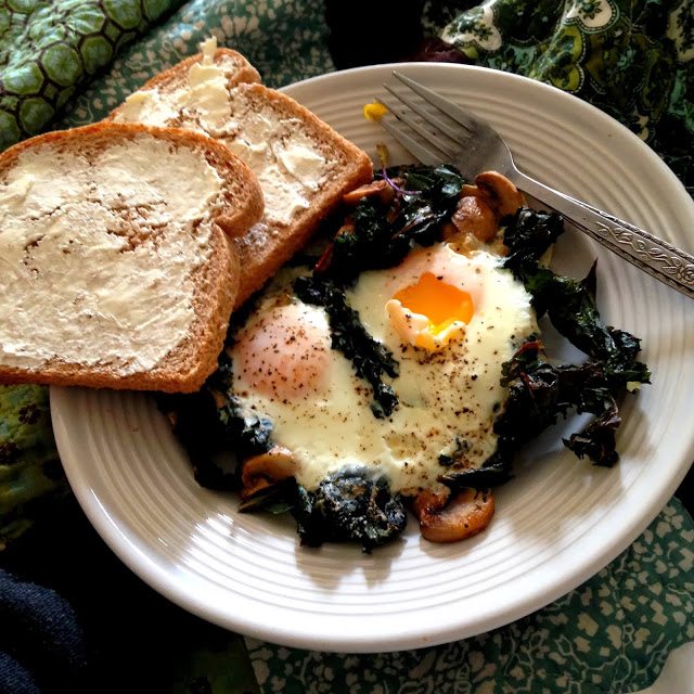hangover cure…fried eggs with kale and mushrooms and buttered toast.