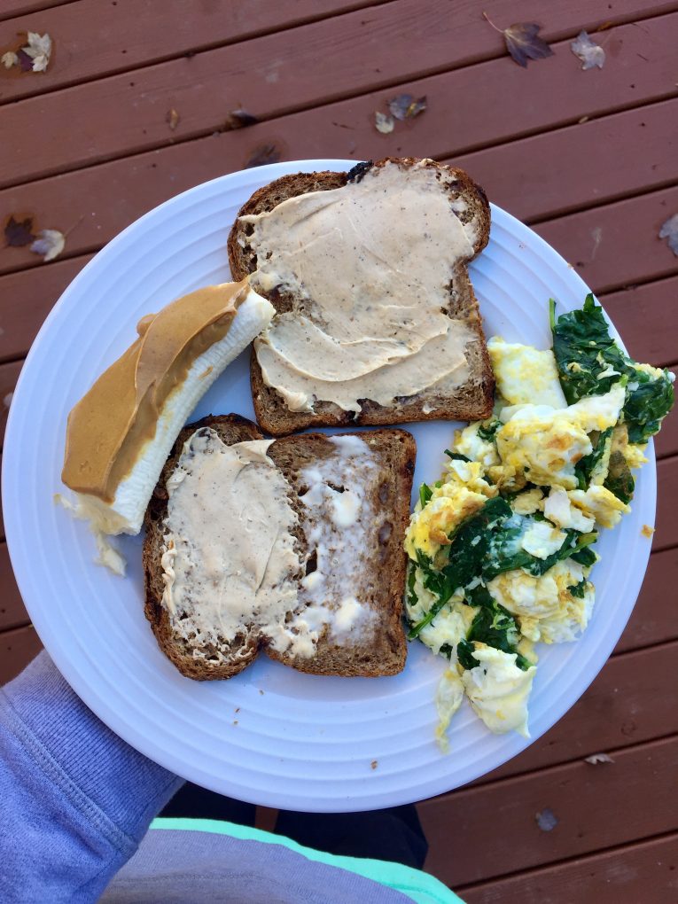 Breakfasts were pumpkin pancakes, or eggs + toast. I get indecisive when it comes to toast spreads so this day is was ¾ TJs pumpkin cream cheese and ¼ butter plus eggs with spinach and banana + PB. Want to know why I often eat half bananas? Because I am so obsessed with banana and PB that I eat it several times a day (and bananas in my smoothies too) and more than 3 bananas a day makes me constipated. TMI? Sorry.