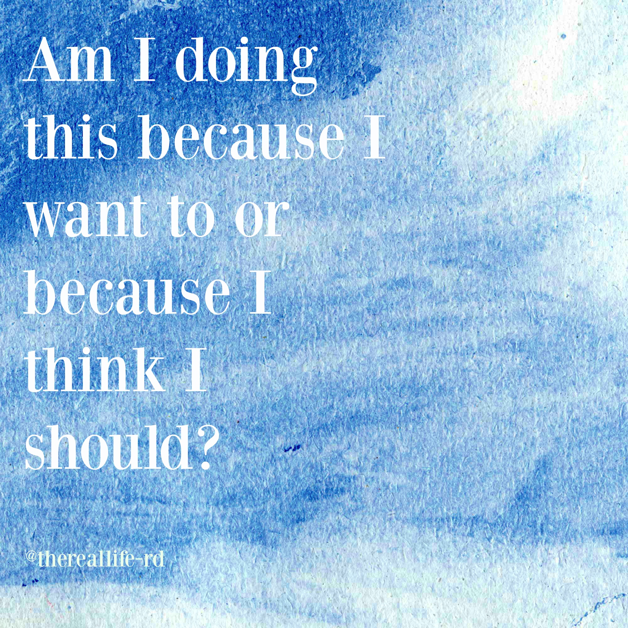 One thing I talk with clients about is asking the question, “Am I doing this because I want to or because I think I should?” Whether that’s eating a certain food or meal or doing a particular workout…do you want to do this or do you think you should? It’s staggering how often we do things because we think we should.