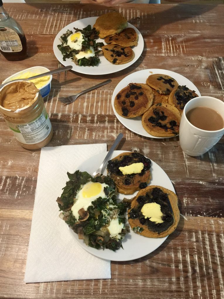 Sunday I went grocery shopping right when we woke up and Nick made brunch. Blueberry pancakes using this recipe along with eggs and sautéed kale, mushrooms and onion. Plus loads of coffee.