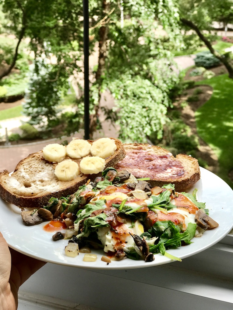 Weekend breakfast – sourdough toast and veggie egg bake. Just sautée mushrooms and onions in butter, throw in some spinach until it wilts and then crack eggs on top. Cook over medium heat until the eggs set and then pop the pan under the broiler until the eggs finish cooking (you want soft yolks)