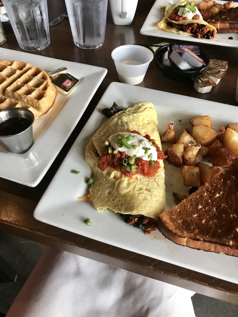 I went with the chorizo omelet that also had black beans, cheddar, salsa and sour cream. Along with an oat waffle because I was craving it and hadn’t had a waffle in sooo long. I need to buy a waffle maker because this was fab! I shared what I was too full to eat with the rest of the table. The omelet was good, but had way too much chorizo. But that waffle…great choice.