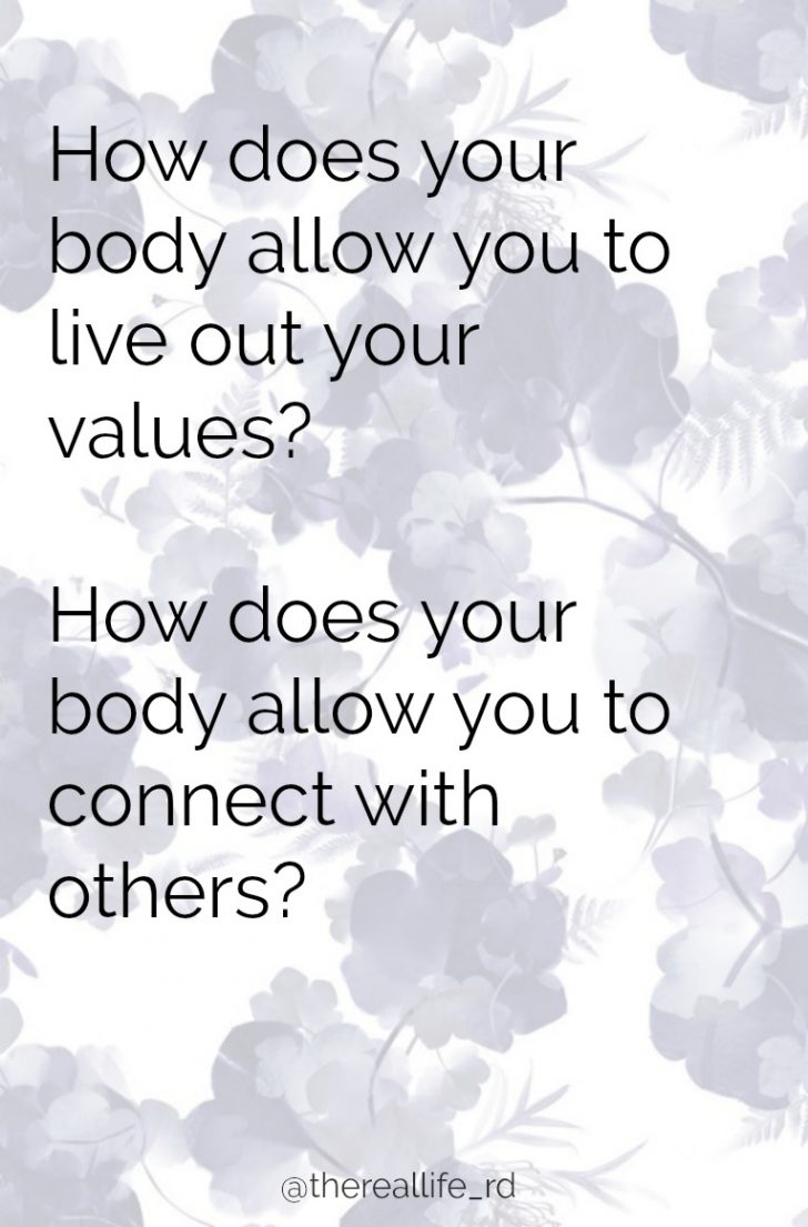 Circle back to your values. How does your body allow you to live out your values? How does your body allow you to connect with others? For me, my natural body size allows me to say yes to spontaneous dinner dates with my husband or a trip to the ice cream shop with a friend. My micromanaged smaller body size wouldn’t be able to tolerate those things without crazy food rules and exercise habits.