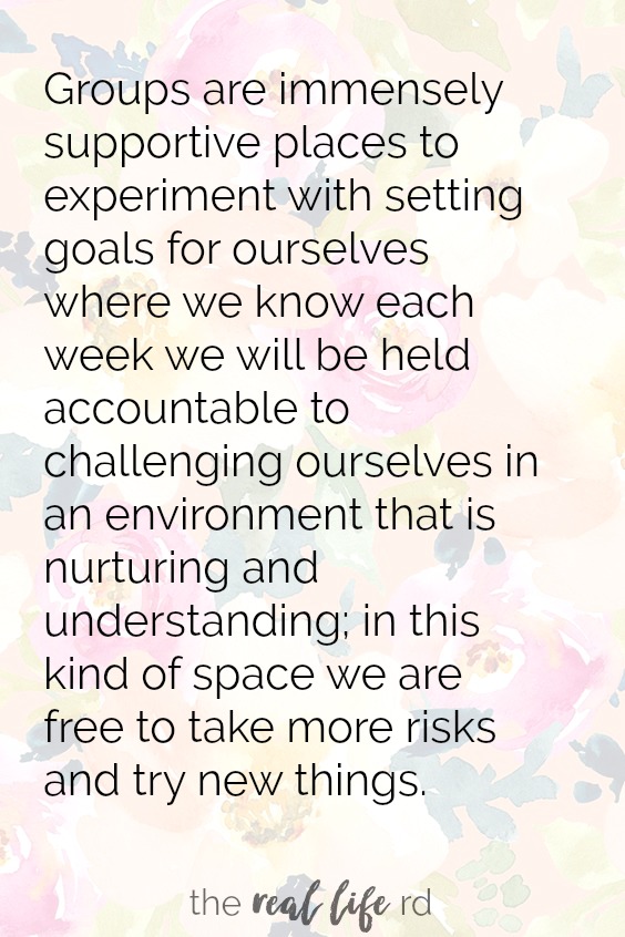This is one of the main reasons group support is so helpful, it allows for a safe space in which we can really show up as ourselves, struggles and flaws and all, and see that we are accepted and not “the only one in the whole world who’s had these crazy thoughts.” Groups are immensely supportive places to experiment with setting goals for ourselves where we know each week we will be held accountable to challenging ourselves in an environment that is nurturing and understanding; in this kind of space we are free to take more risks and try new things. That’s refreshing! When I participated in a Mindful Eating Support Group many years ago I grew exponentially in my journey with being deeply present to myself, my emotions, my body, as well as my needs and desires. Knowing that I was not alone in my struggle and that others were rooting for me to live my fullest life as I began practicing new skills completely kickstarted my healing journey. Since then I have loved facilitating groups professionally and truly believe that it is one of the most effective tools for change and growth.