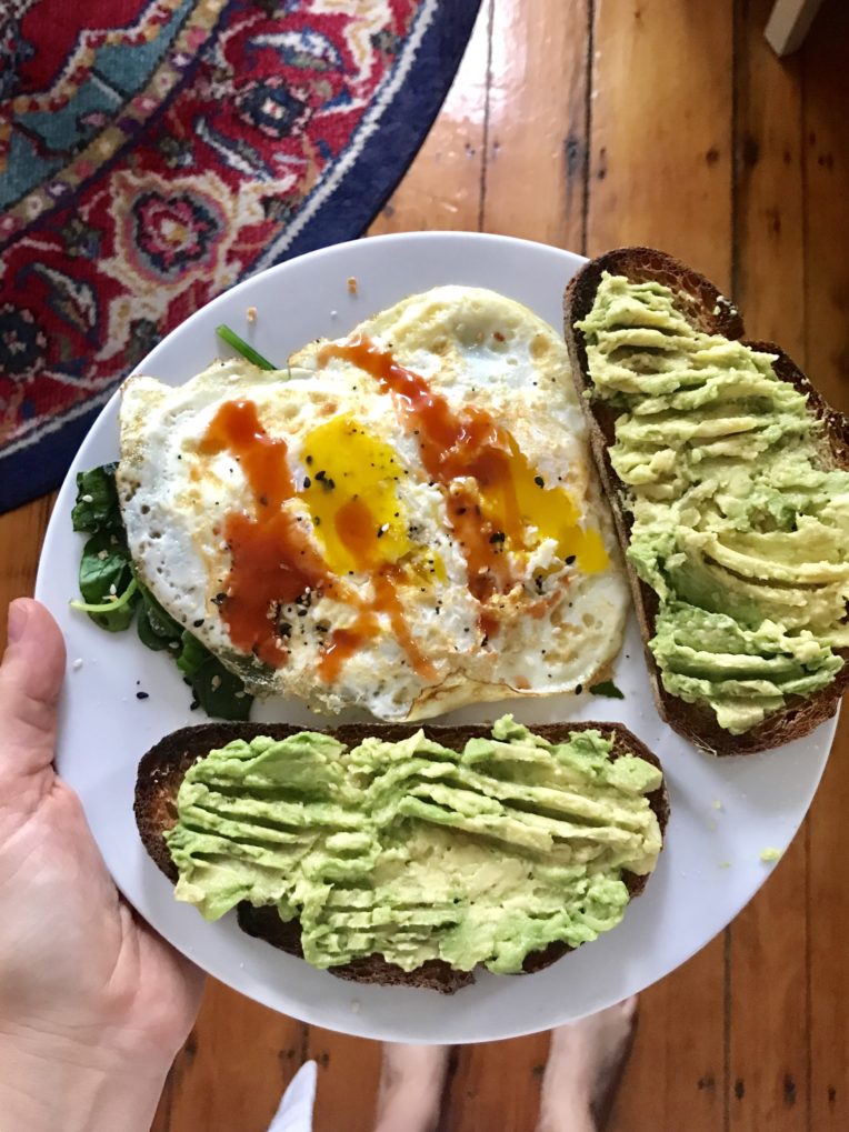 Toast is always in rotation. Although lately I go through phases with bread. Sometimes it’s all that sounds good and other times it sounds disgusting. Half topped with avocado, the other half with whipped cream cheese + jam plus a couple scrambled eggs and berries.