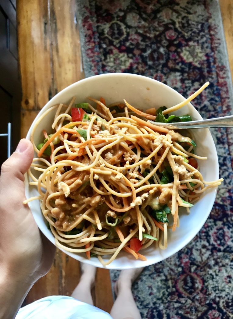 I couldn’t decide what the heck to prep for lunches this week and then came across these peanut noodles over at POY when I was looking for a dinner recipe. Boiling noodles was the only cooking involved. Done. I switched the recipe up a bit by using spinach instead of red cabbage (less chopping) and added in shredded carrots and scallions. Instead of soba noodles I used TJs yellow lentil spaghetti because it is GOOD and the most perfect texture – not mushy or starchy or any other grossness. I always have some of this pasta on hand because one of my go to quick lunches or dinners is the pasta + sauteéd greens + olive oil and sea salt. I used this pasta for this recipe because it has a good amount of protein in it already from the lentils, which means I didn’t add the chicken in the recipe which saved me time and $$$.