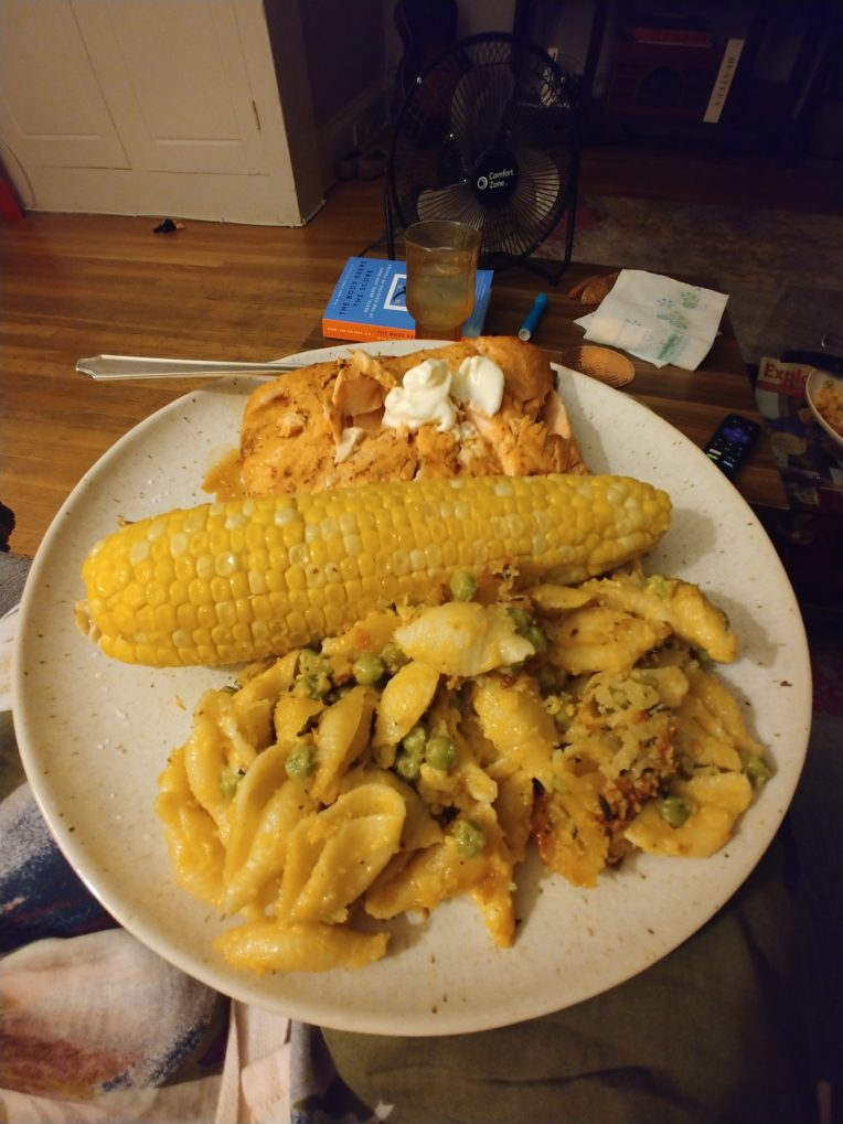 Salmon w mayo & soy sauce + corn w/ butter & salt + pumpkin mac&cheese – Really satisfying!